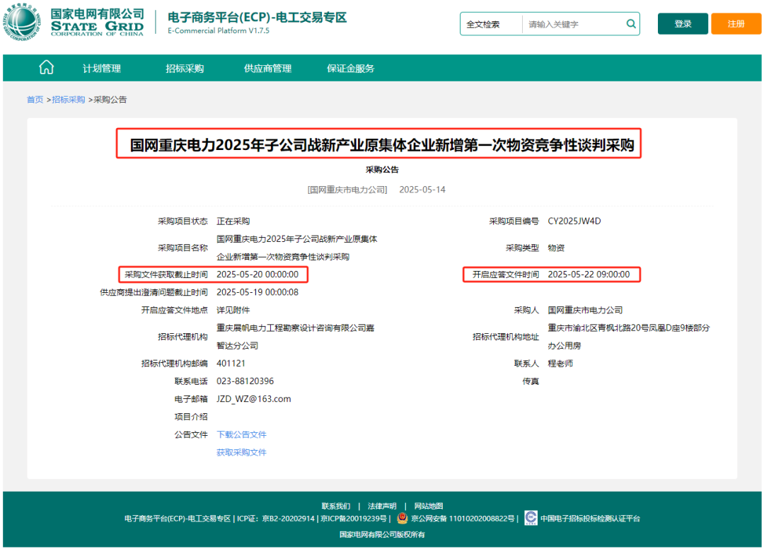 【采购公告】国网重庆电力2025年子公司、战新产业、原集体企业新增第一次物资竞争性谈判采购公告